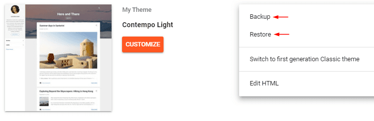 इसके लिए “Theme” में जाएँ वहां पर आपको “My theme” section में right side में तीन dots दिखेंगे उसपर क्लिक करें। एक मेनू open होगा जहाँ से आप पहले “Backup” पर क्लिक करके अपने थीम की बैकअप ले लेवें। इसके बाद “Restore” पर क्लिक करें और download किये गये template की XML file को upload कर दें।