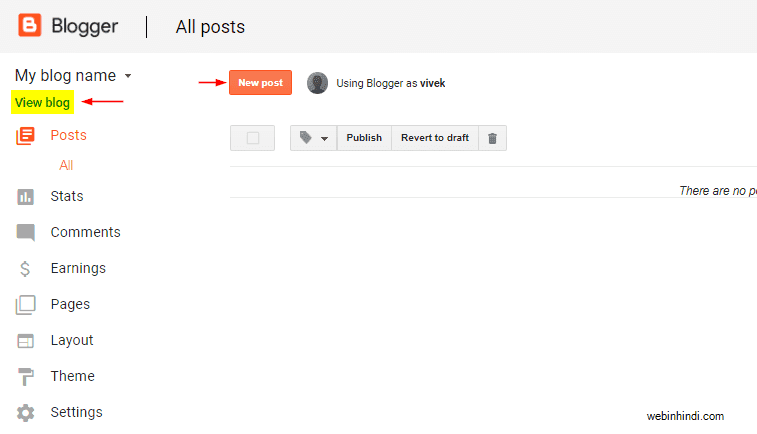 Step 4: अब आपका ब्लॉग बन चुका है। इसे आप “View blog” में जाकर देख सकते हैं। अभी आपके ब्लॉग में कोई भी कंटेंट या आर्टिकल पोस्ट नही किया गया है, इसके लिए आप “New post” बटन में क्लिक करके नया पोस्ट लिख सकते हैं।